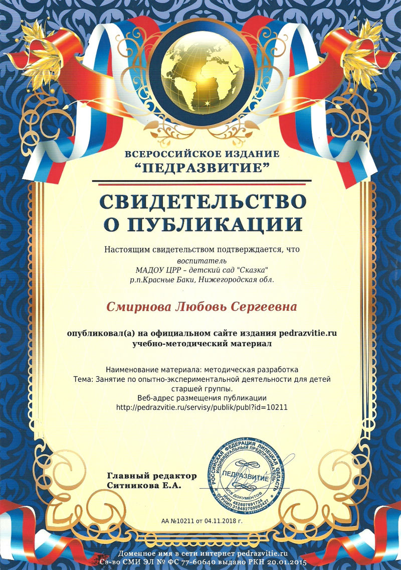 Свидетельство о публикации методической разработки "Занятие по опытно-эксперементальной деятельности для детей старшей группы"
