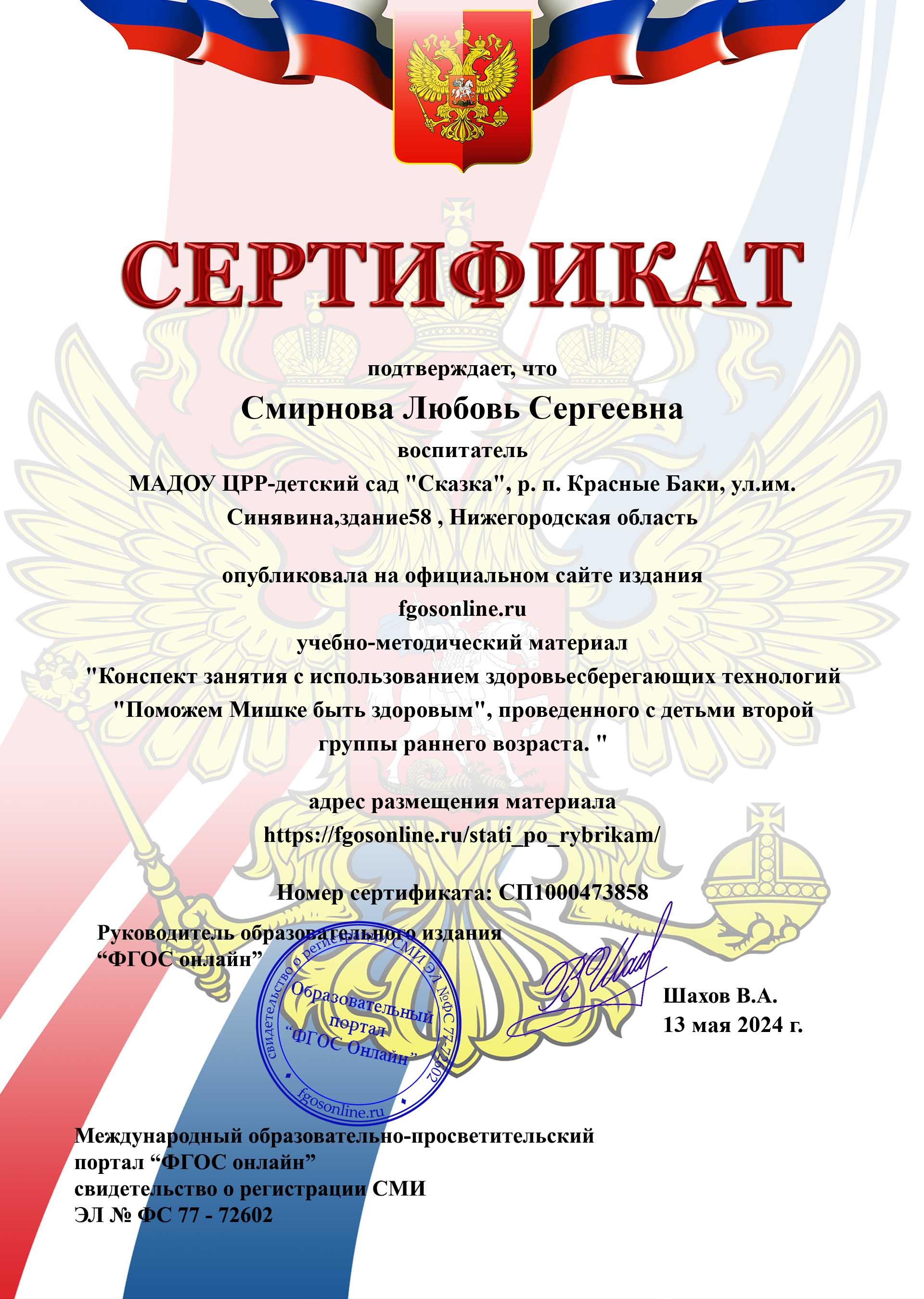 Смирнова Любовь Сергеевна - воспитатель МАДОУ ЦРР д/с "Сказка" р.п.Красные Баки